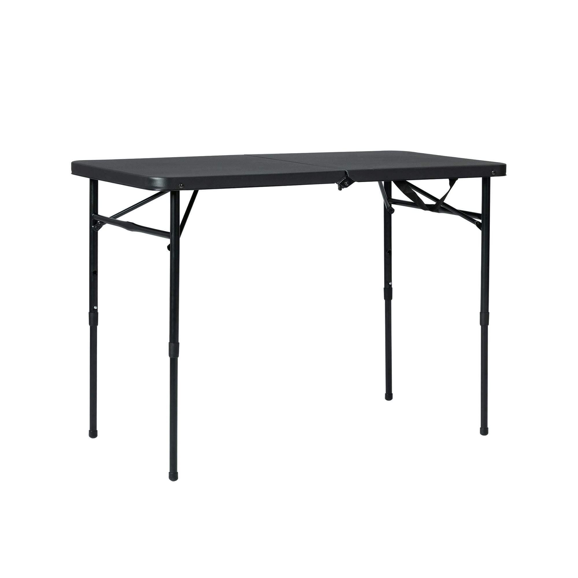 Provide all of the table spaces that you need in all kinds of settings with the 40" Fold-in-Half Table in Rich Black. This versatile rectangular table is sturdy and durable, made with reliable materials, folds for easy storage and transportation, and adjusts to three different heights. When you're finished using it, just fold in the metal legs, fold the table in half, and your new compact table is ready for transport! Its classic black color is sure to fit in at any gathering in any setting, and its spacious expanded 40" long table-top is ideal for holding a wide variety of foods, crafts, or whatever items you are working with! It's great for everyday use both indoor and outdoor, as a serving table, craft supply table, outdoor meal table, or for whatever purposes you may need. The plastic tabletop is easy to clean with no fuss just wipe it down with a damp cloth, and it will look as good as new! The carrying handle makes it perfect for taking on the go, for outdoor barbecues, game nights, school activities, parties, or tailgating events. The tabletop is large enough to be able to sit the whole group down around the table, so all of your friends and family can be included.