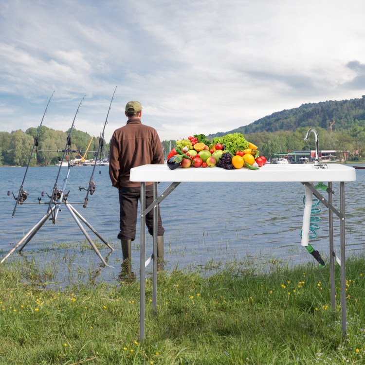 The quick-connect faucet is simple to set up and attach to a garden hose, & the extending sprayer gives you water pressure where you need it. With a durable sloped surface and integrated sink with drain, this table gives you the convenience of your kitchen in the great outdoors. The folding legs allow you to take this table anywhere.