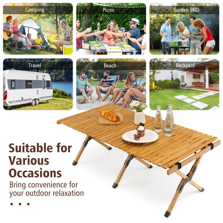 ● Durable Bamboo Picnic Table: This folding camping picnic table is crafted with 100% natural bamboo with exquisite polishing treatment, which is sturdy, durable, crack-resistant, and burr-free, ensuring long service life. And with the PU coating, the surface is waterproof for easy cleaning. It is recommended not to be exposed to the sun or rain for a long time.