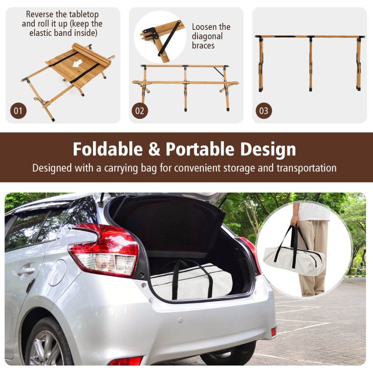● Easy Installation: The wooden travel camping table is effortless to set up and requires no tools. All you need to do is unfold the frame and fix it with diagonal braces, then unfold the tabletop and fix it into mounting holes. Thanks to the flexible elastic bands, the tabletop is easy to stretch.