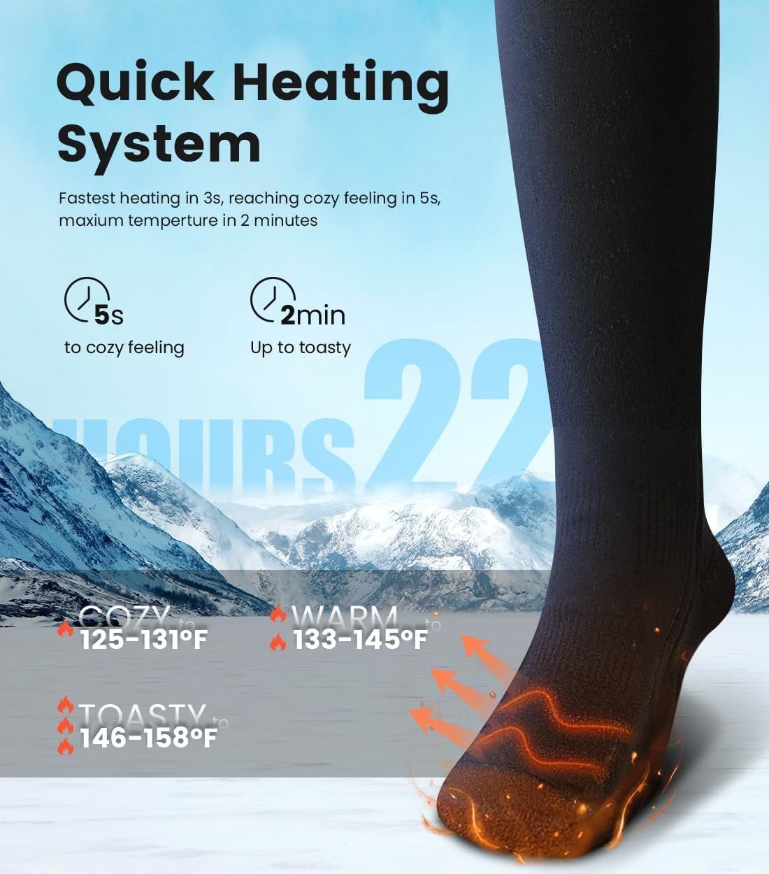 [360° All-Round Heating]- Our electric heating socks wrap heating elements around the toes, top and bottom of the foot, allowing you to experience all-round warmth. Let every inch of your feet be enveloped in soothing, even heat. No more cold spots or discomfort![